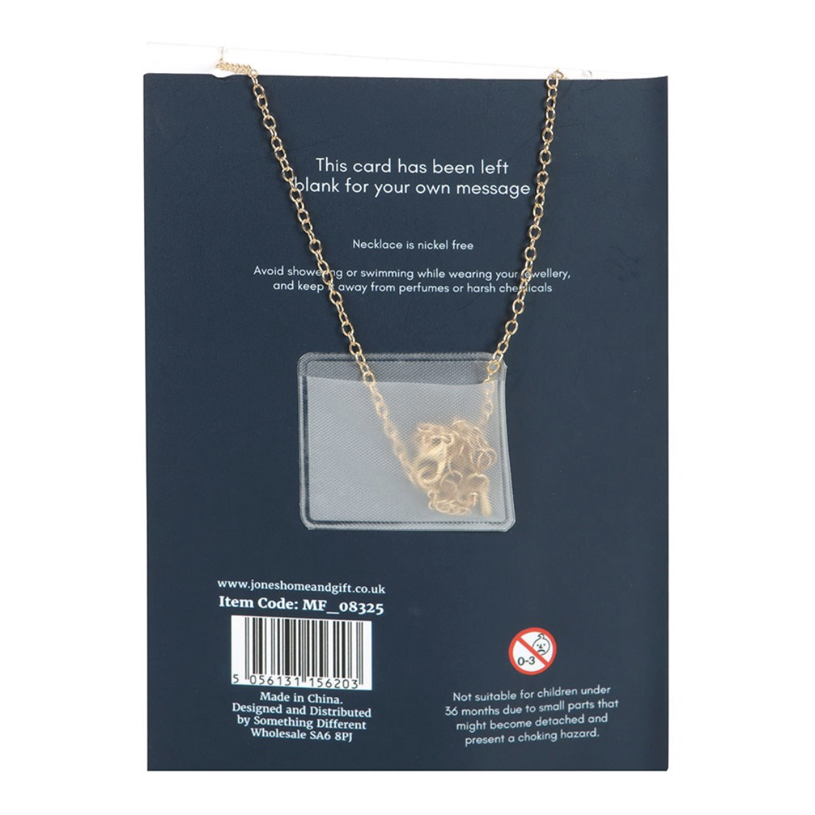Mystický náhrdelník s motivem sovy je součástí sladěného blahopřání, takže to může být perfektní dárek pro vaše blízké se vztahem k duchovnu, mystičnu, nebo sovičkám. Přání zdobí motiv lesa a noční oblohy, doplněné nerezovým řetízkem bez niklu s přívěskem v podobě letící noční sovy. Přáníčko je uvnitř prázdné a dodává se se zlatou obálkou.