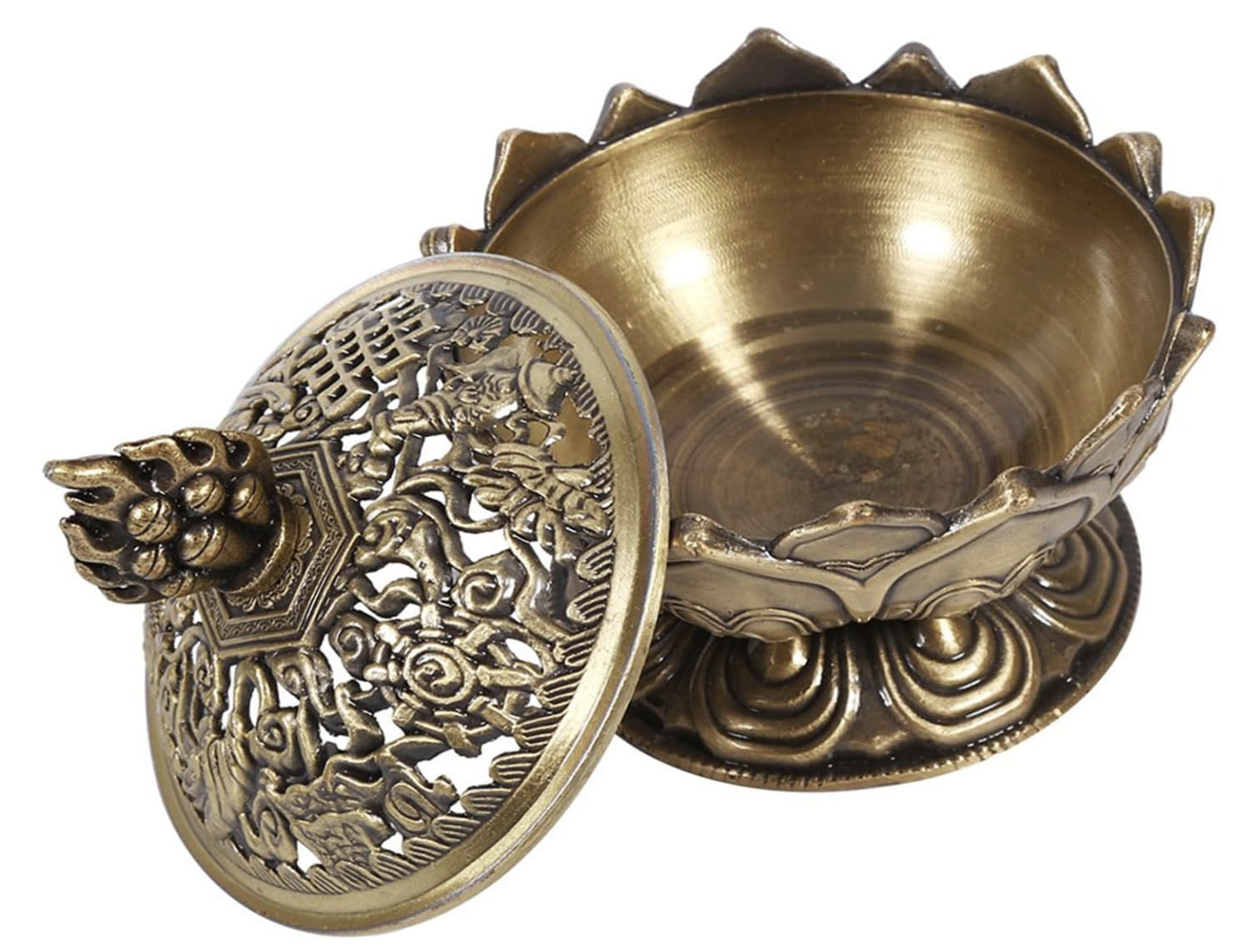 Krásná mosazná kadidelnice na vonné jehlánky s motivem lotosového květu. Sledujte, jak z ní majestátně stoupá dým. kadidelnice bude skvělým doplňkem vaší domácnosti, nebo jako originální krásný dárek. Lze ji také použít jako malou schránku na drobnosti.