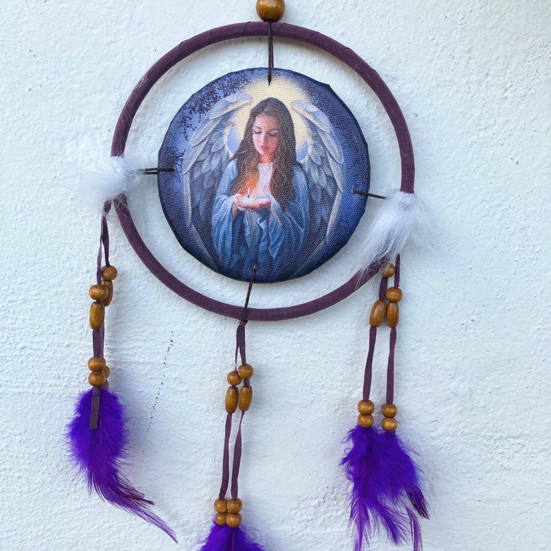 Lapač snů s obrázkem anděla držícího svíčku. Design lapače je navržen uznávanou umělkyní Lisou Parker.