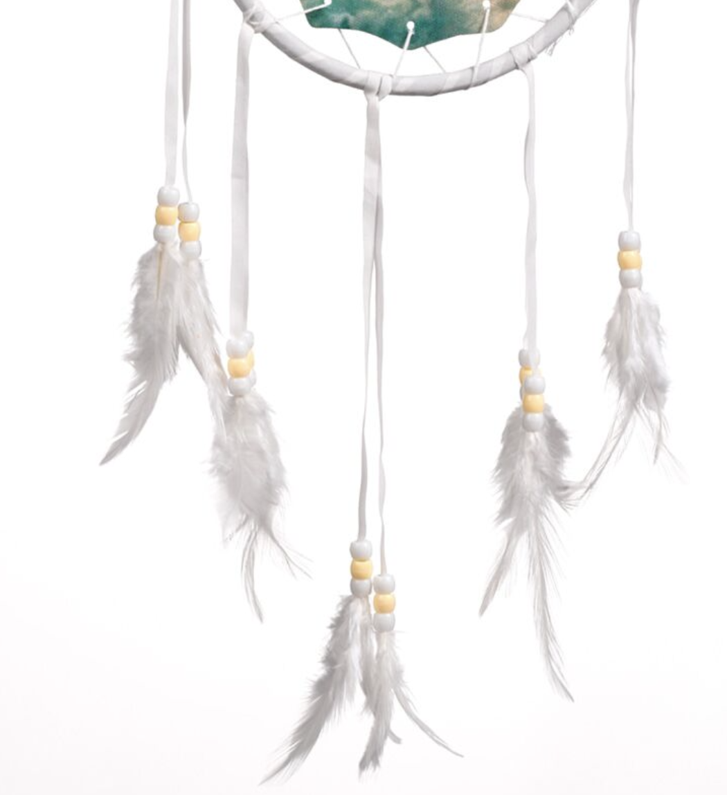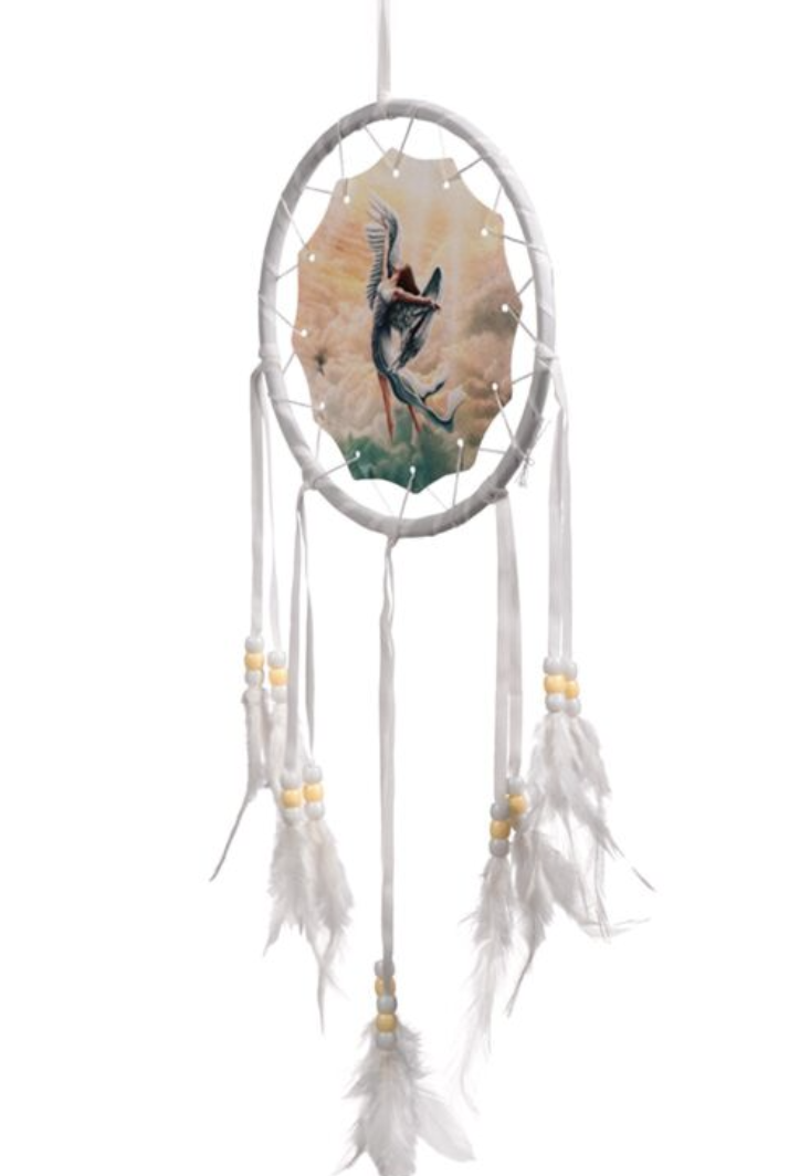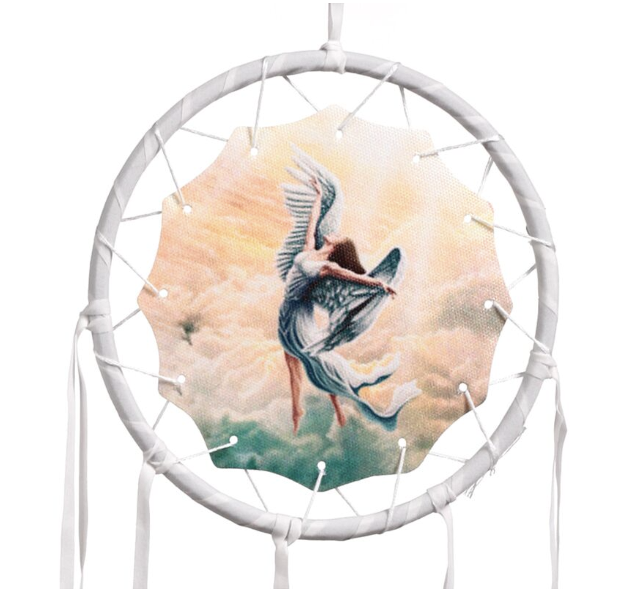 Lapač snů s obrázkem anděla na nebi. Design lapače je navržen uznávanou umělkyní Natashou Faulkner.