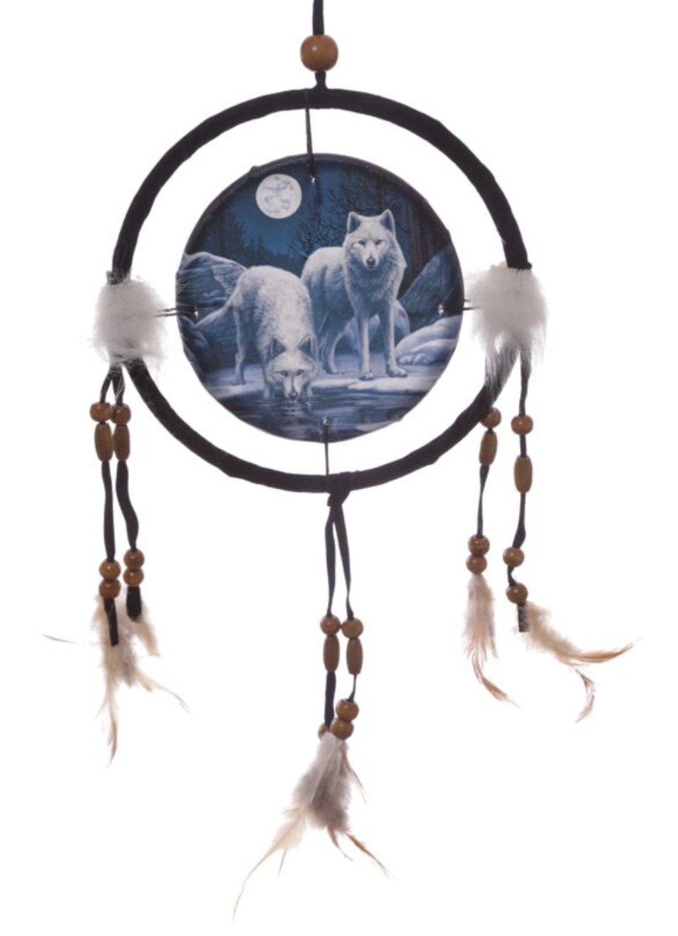 Lapač snů s obrázkem dvou vlků a měsícem. Design lapače je navržen uznávanou umělkyní Lisou Parker.