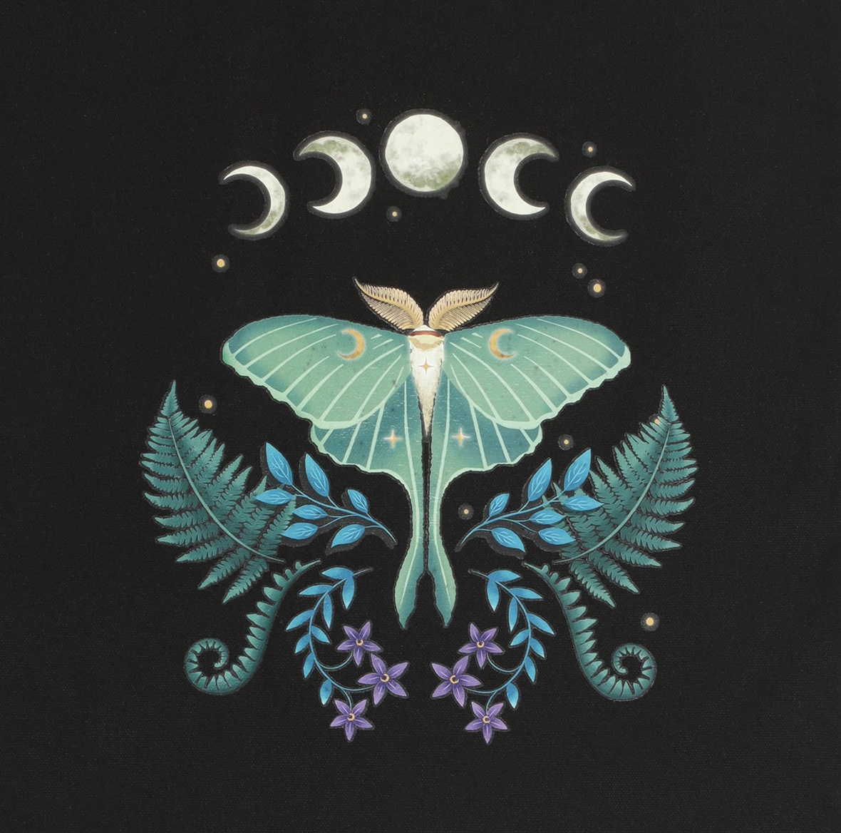 Nádherná taška s mystickým motivem nočního motýla na odolném černém polybavlněném plátně. Vezměte si s sebou kouzlo přírody, ať už jdete kamkoli. Potisk je na přední straně, druhá strana je bez potisku.
