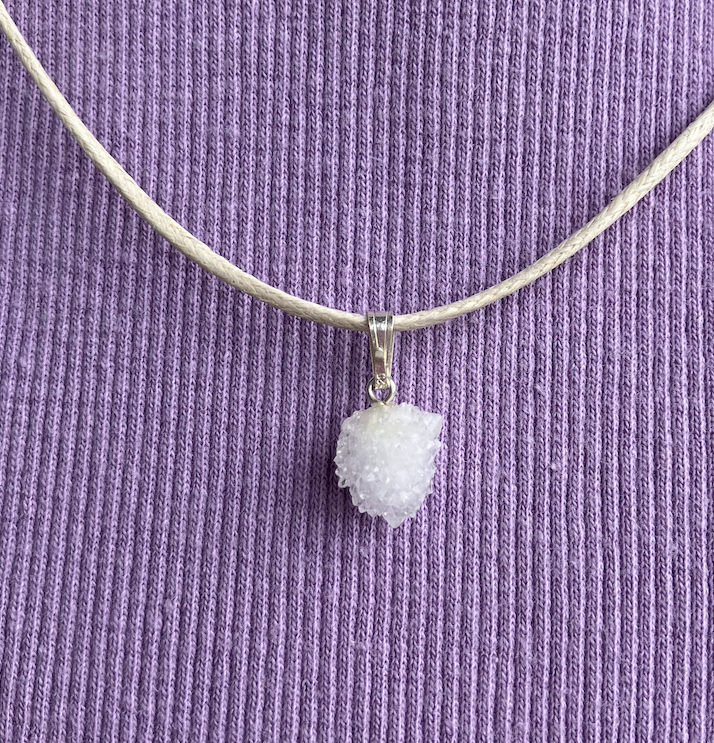 Materiál: Přírodní křišťál z Brazílie, malá drúzička připomínající vzhled sněhové kuličky. Váha cca 1,1gr. Rozměr cca 1,7cm i s úchytem. Očko z pravého stříbra (ryzost Ag925). Bavlněný provázek béžový.