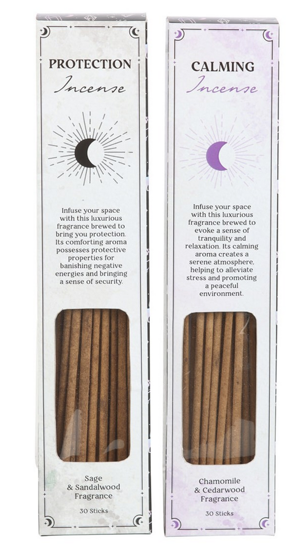 Tyto vonné tyčinky se prodávají jako sada 2 balení, s 30 tyčinkami šalvěje a santalového dřeva (ochrana) a 30 tyčinkami heřmánku a cedrového dřeva (uklidňující).