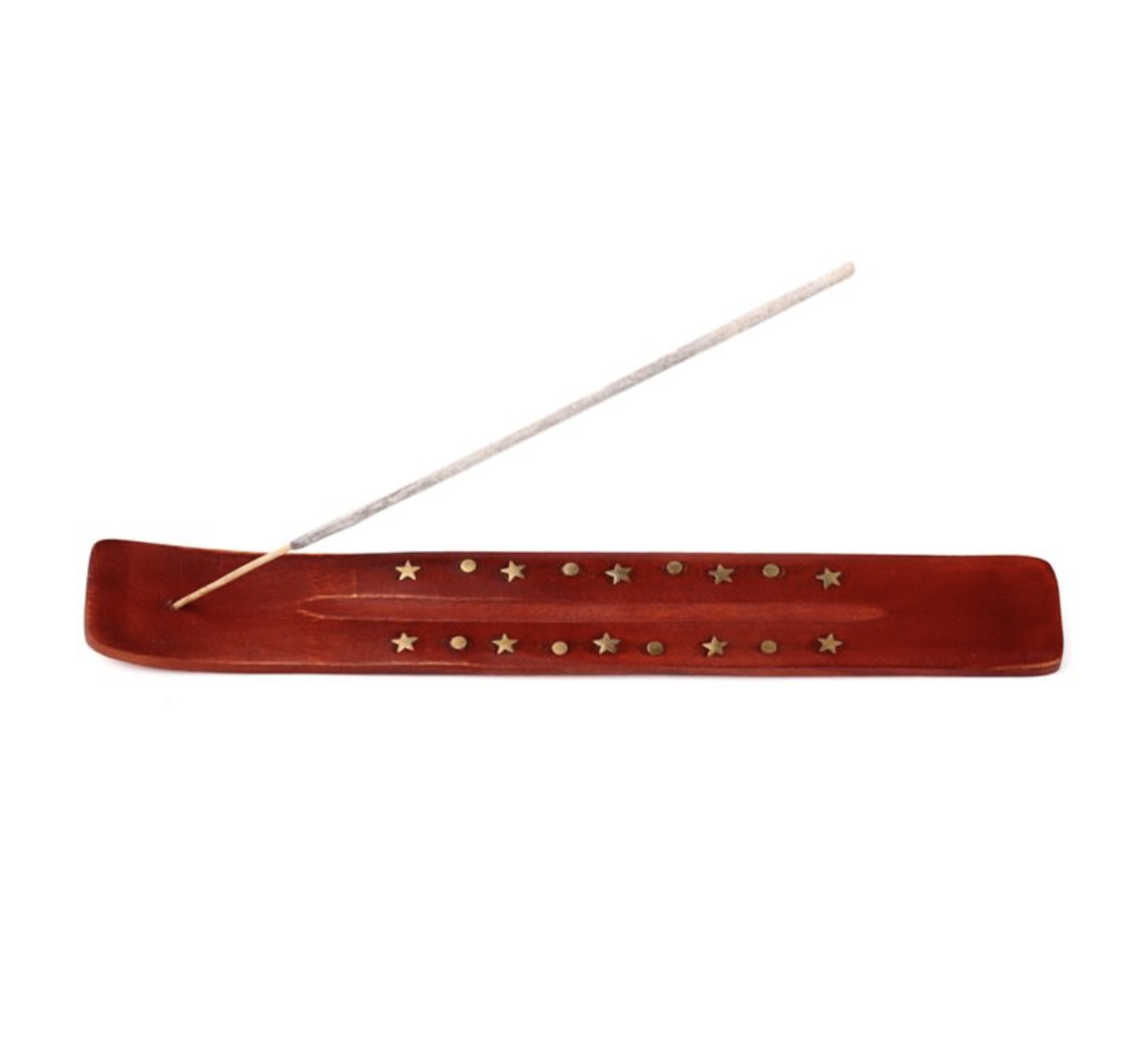 Dřevěný stojánek na vonné tyčinky je zdoben mosaznou intarzií v podobě hvězd a kruhů. Stojánek je vhodný pro indické vonné tyčinky - to znamená na vonné tyčinky s bambusovým dřívkem.