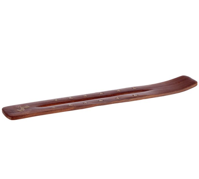 Dřevěný stojánek na vonné tyčinky je zdoben mosaznou intarzií v podobě jednorožce. Stojánek je vhodný pro indické vonné tyčinky - to znamená na vonné tyčinky s bambusovým dřívkem.